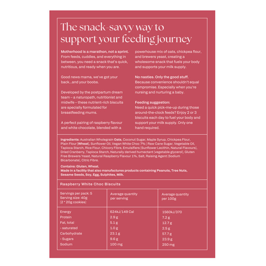 A perfect pairing of raspberry flavour and white chocolate is blended with a powerhouse mix of oats, chickpea flour and brewers yeast, creating a wholesome snack that fuels the body and supports milk supply.