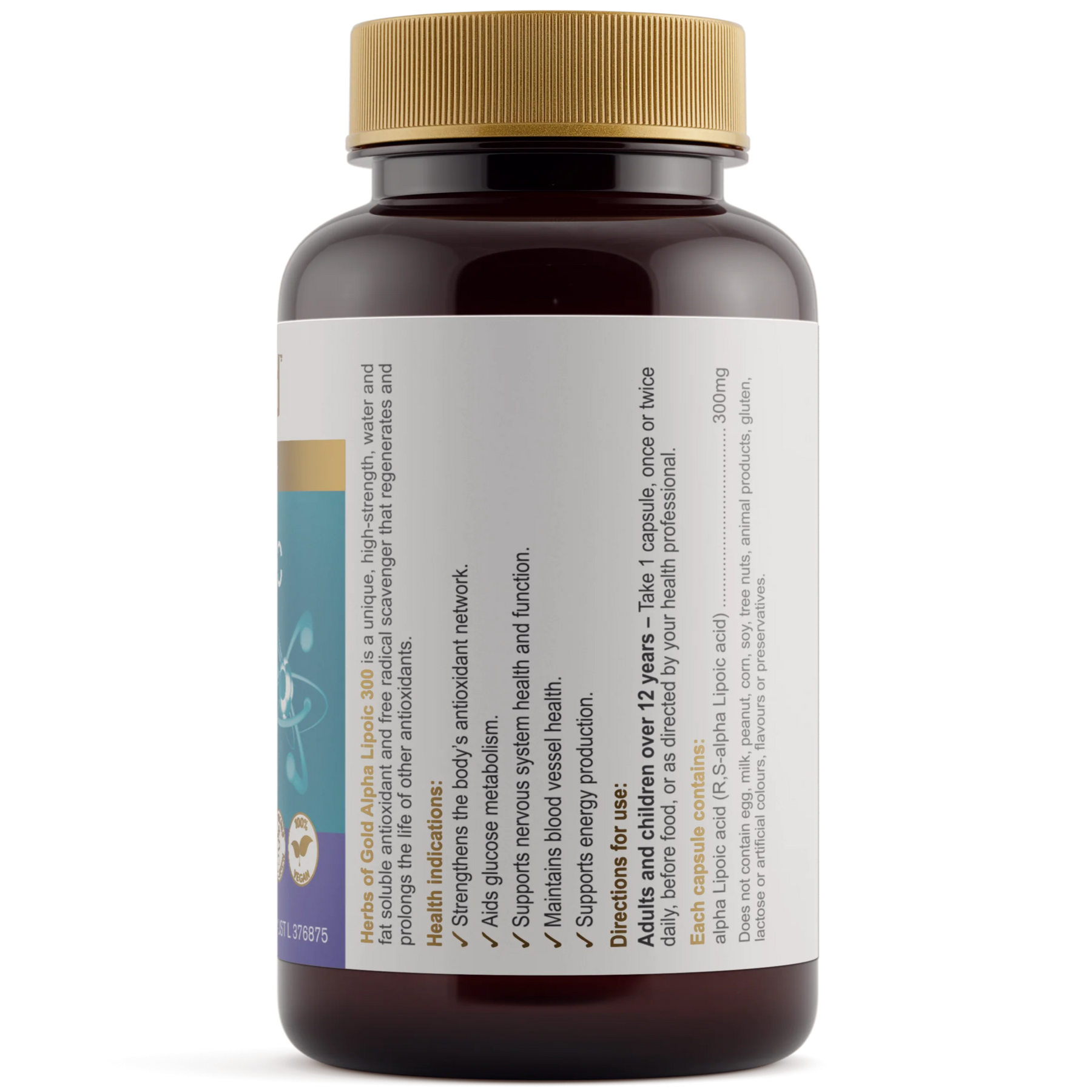 Herbs of Gold Alpha Lipoic 300 contains high-strength alpha Lipoic acid, an antioxidant that reduces free radicals formed in the body.