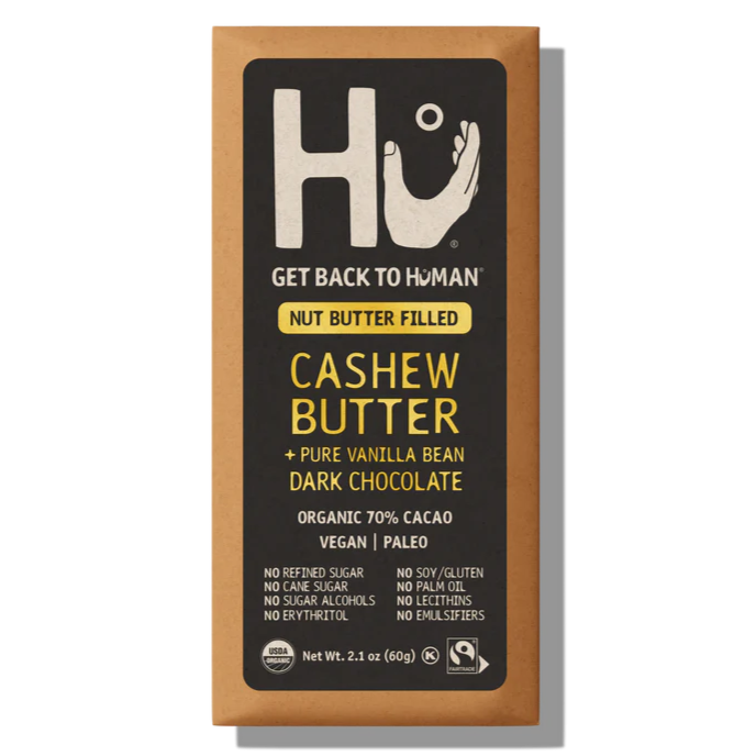 Hu Organic Dark Chocolate Cashew Butter & Vanilla is a creamy, indulgent treat made with organic 70% dark chocolate and a smooth cashew butter filling, enhanced with natural vanilla. Free from refined sugars, dairy, soy, and emulsifiers, this rich and satisfying chocolate bar is perfect for those seeking a clean, delicious snack without compromise.