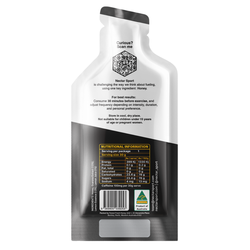 Your kickstart in a sachet. Your body was built to run on real food. This gel is made from 100% raw honey with the added boost of guarana, that’s it. Fast-absorbing. Long-lasting. No crash. No chemicals.