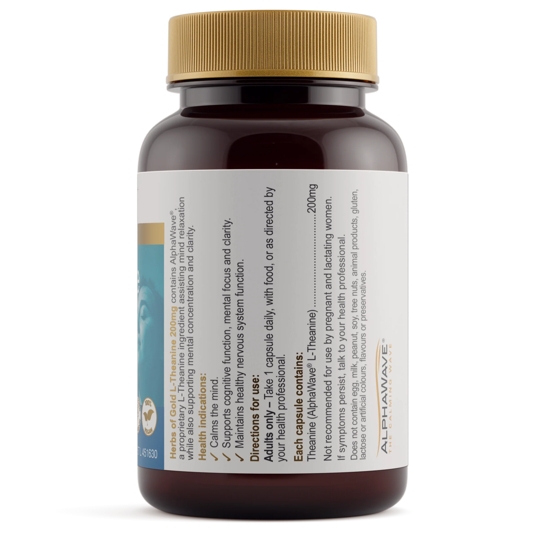 Herbs of Gold L-Theanine 200mg provides high-strength theanine, an amino acid that assists mind relaxation.