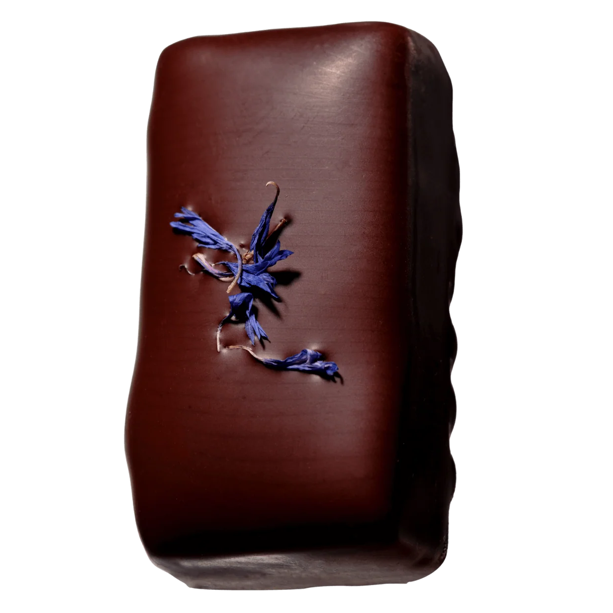 Chewy almond butter caramel blended with crunchy tamari toasted almond pieces for that umami experience. Spiked with adaptogen ashwagandha. Topped with brilliant blue corn flowers for your visual pleasure. Touching all the senses with this delicious delight.