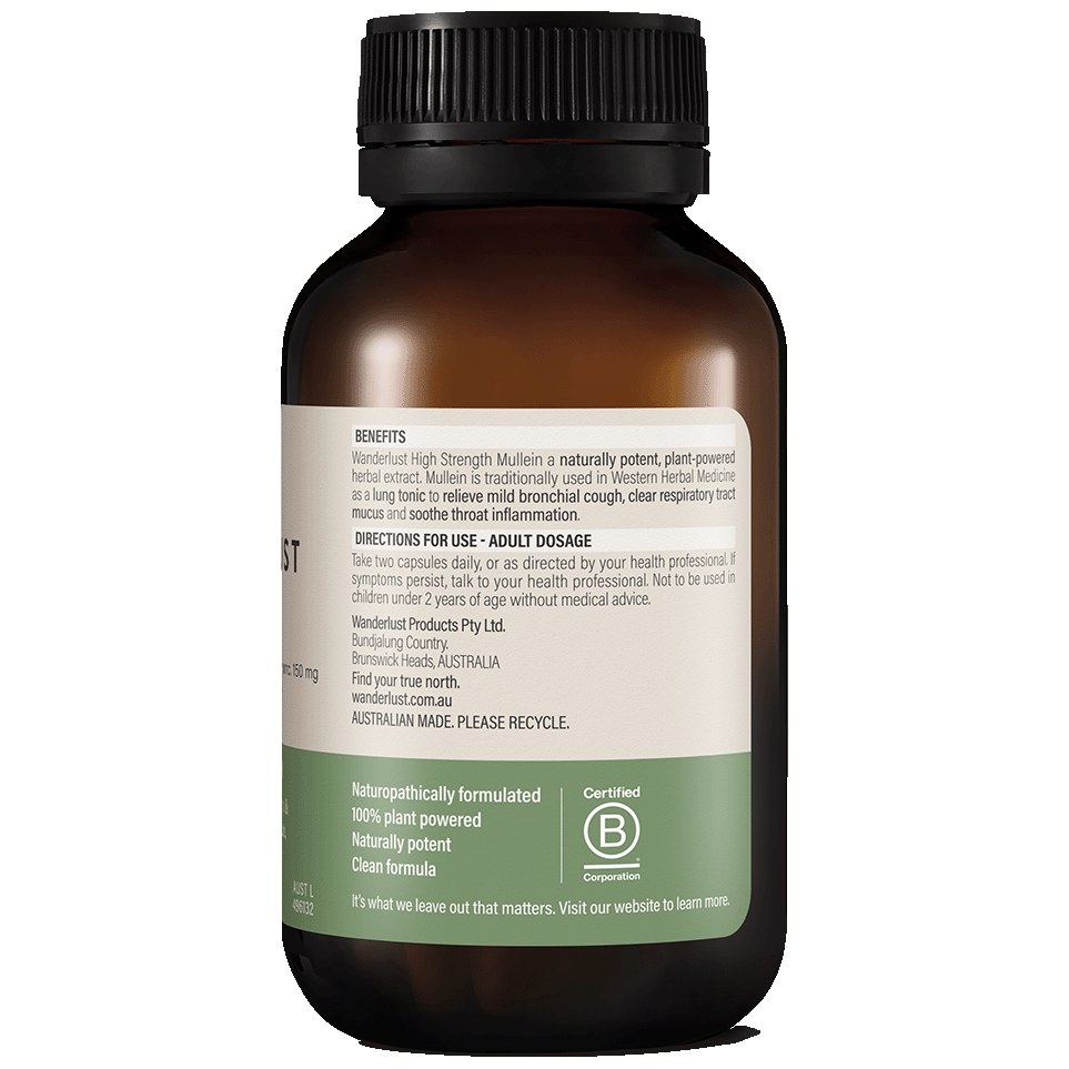 Wanderlust High Strength Mullein is a naturally potent, plant-powered herbal extract. Mullein is traditionally used in Western Herbal Medicine as a lung tonic to: