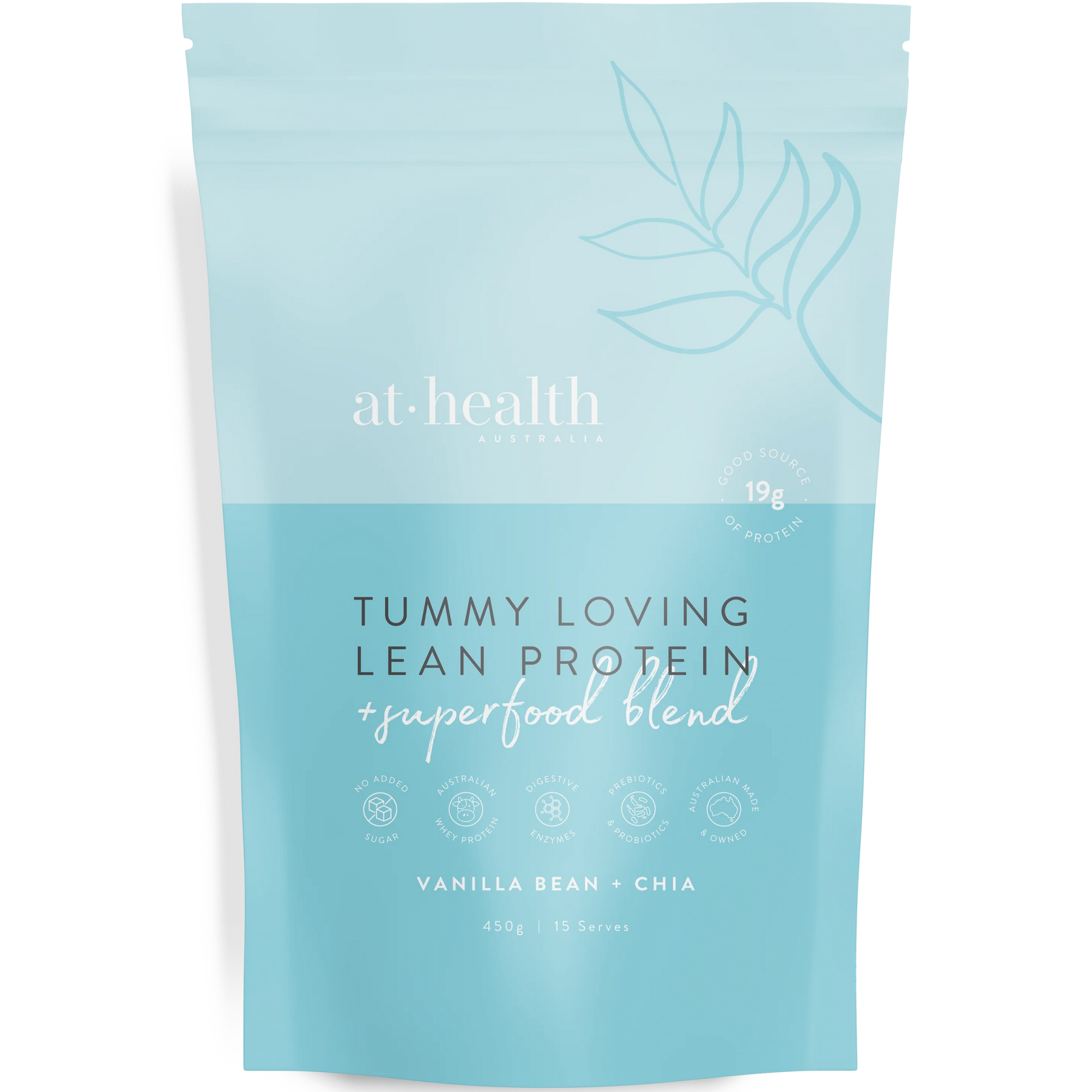 At Health's Tummy Loving Lean Protein + Superfood Blend combines creamy Whey Protein Isolate with Probiotics, Digestive Enzymes, Psyllium Husk, Slippery Elm, Chia and L-Carnitine, for a delicious way to support your health and wellbeing.