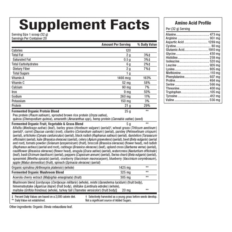 Not suitable for use in pregnancy. Fermented Organic Protein & Greens powder mix should be used as a supplement to a normal diet to address situations where intakes of energy and nutrients may not be adequate to meet an individual’s requirements.