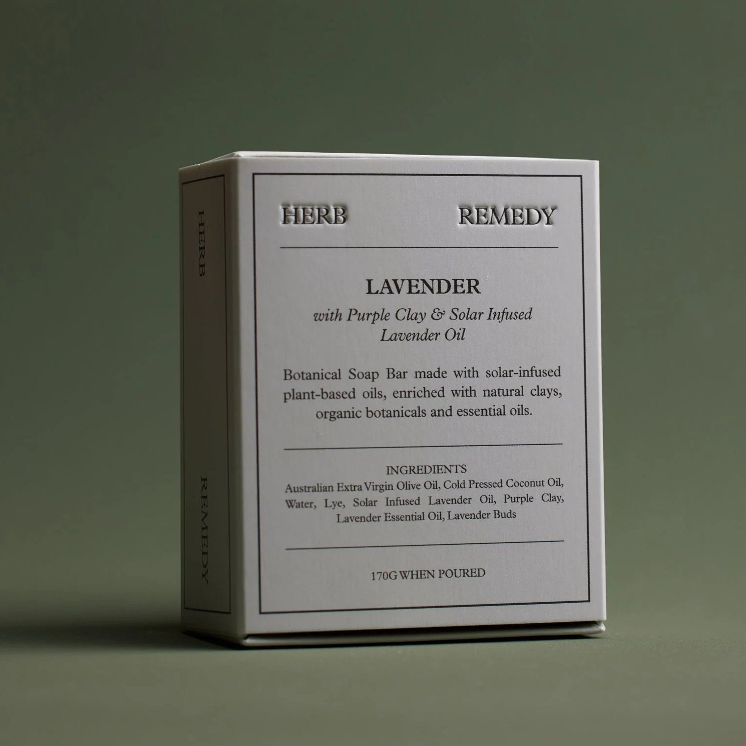 Australian extra virgin olive oil, cold pressed coconut oil, spring water, lye, solar infused lavender oil, Brazilian purple clay, organic lavender essential oil, lavender buds.