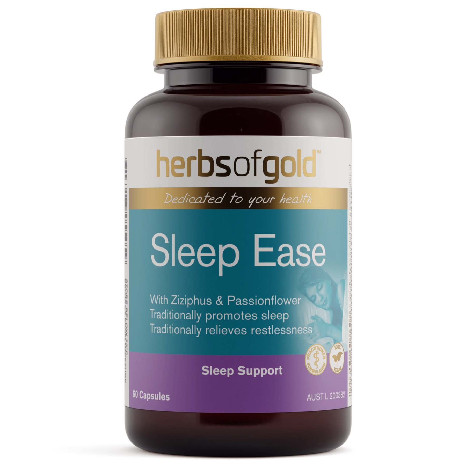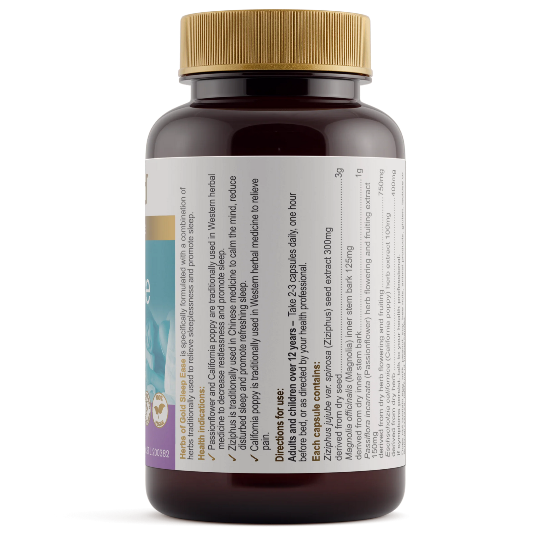 Herbs of Gold Sleep Ease contains herbs traditionally used in Western herbal medicine to promote sleep.