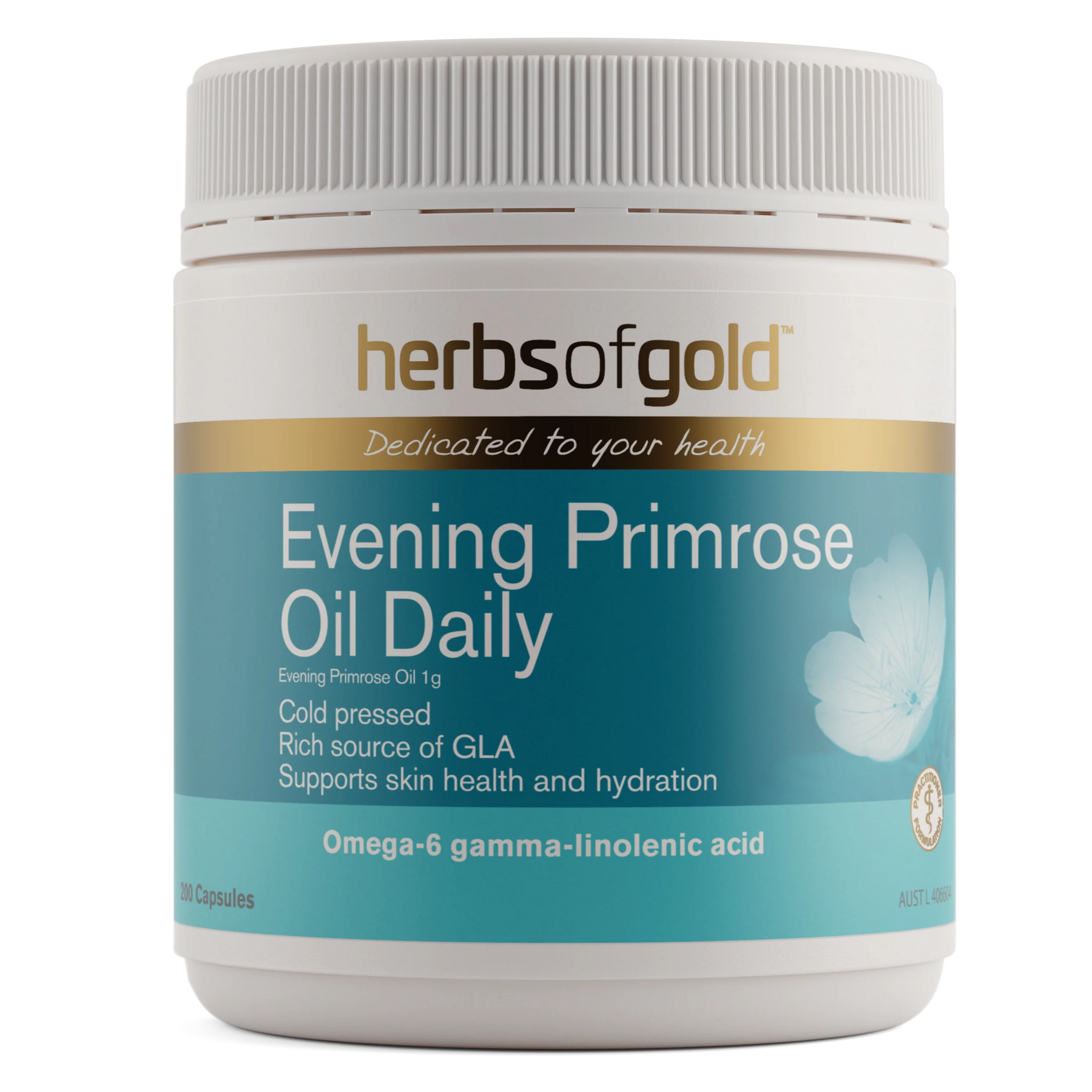 Herbs of Gold Evening Primrose Oil Daily contains 1000mg of high-quality, cold pressed Evening primrose oil in a convenient capsule.