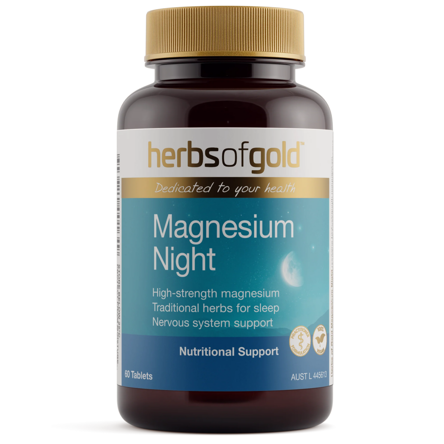 Herbs of Gold Magnesium Night contains a unique combination of magnesium plus Passionflower and California poppy for night-time use.