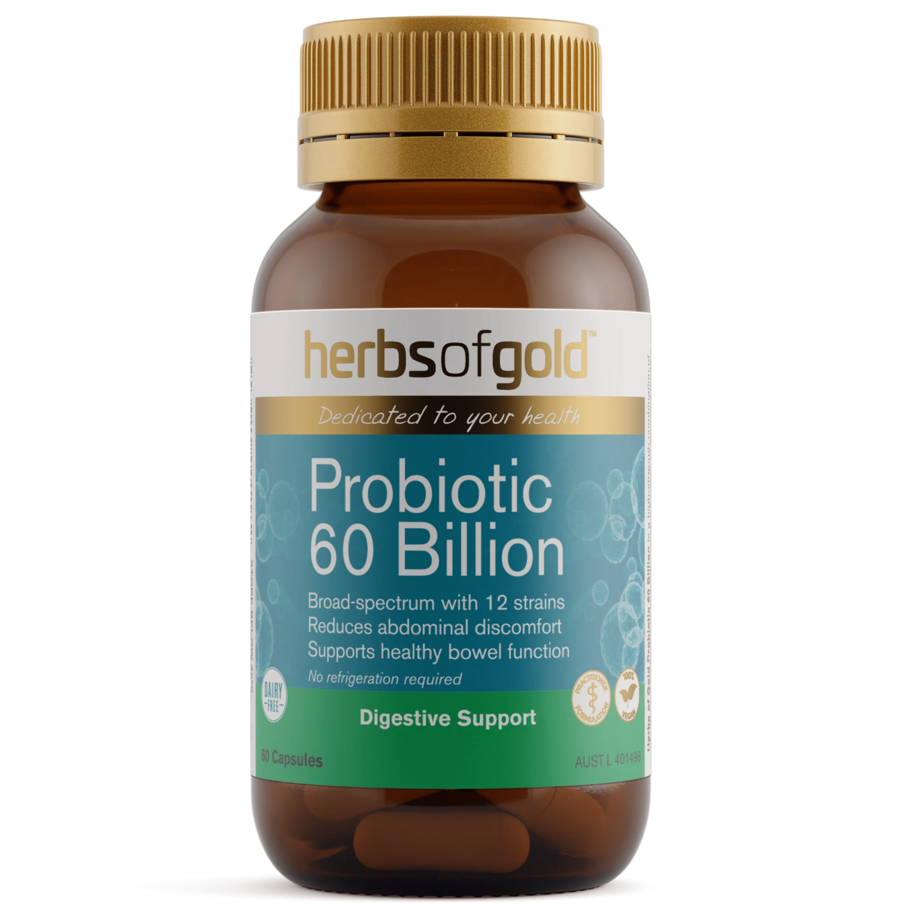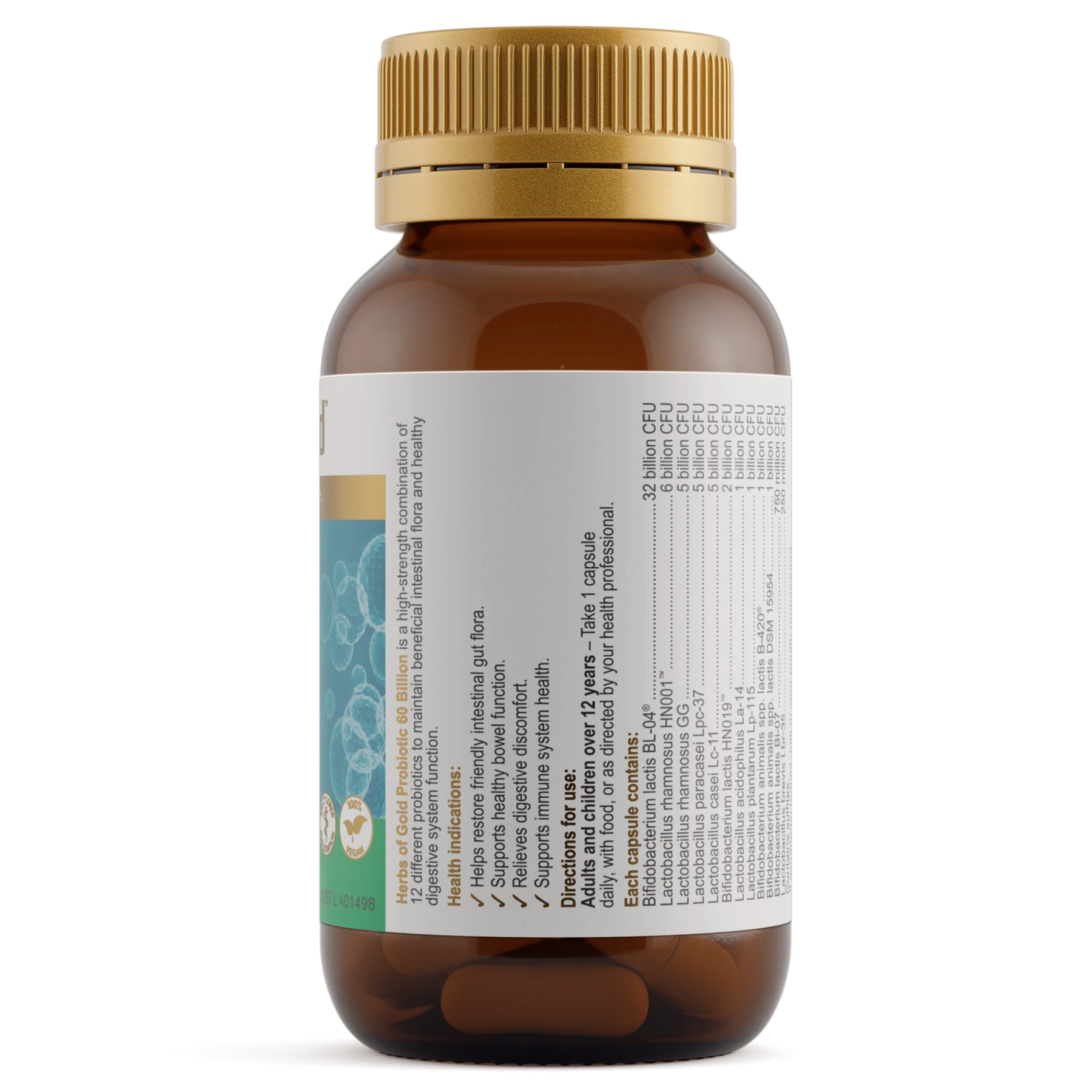 Herbs of Gold Probiotic 60 Billion is a high-strength combination of 12 different probiotics to maintain beneficial intestinal flora and healthy digestive system function