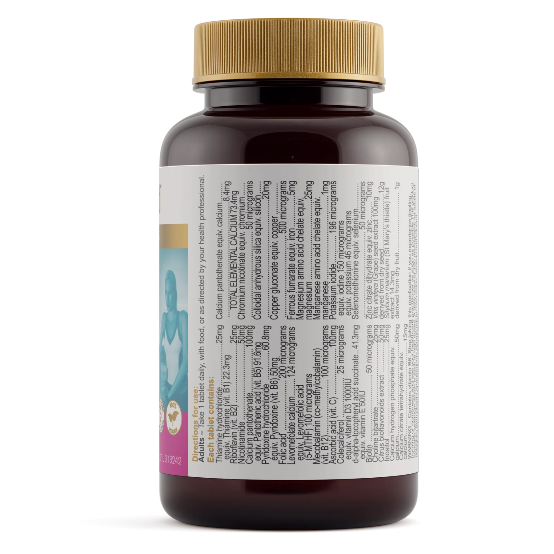 Thiamine hydrochloride (vit. B1) 25mg, Riboflavin (vit. B2) 25mg, Nicotinamide 50mg, Calcium pantothenate 100mg, equiv. Pantothenic acid (vit. B5) 91.6mg, Pyridoxine hydrochloride 60.8mg, equiv. Pyridoxine (vit. B6) 50mg, Folic 200mcg, Levomefolate 124 mcg, equiv. Levomefolic acid (5-MTHF) 100mcg, Mecobalamin (vit. B12) 100mcg, Ascorbic acid (vit. C 100mg, Colecalciferol 25mcg, equiv. vitamin D3 1000IU, d-alpha-Tocopheryl acid succinate 41.3mg, equiv. natural vitamin E 50 IU, Biotin 50 mcg, Choline 25mg, Citrus bioflavonoids extract 50mg, Inositol 25mg, Calcium (as hydrogen phosphate) 50mg, Calcium (as citrate tetrahydrate) 15mg, Calcium (as pantothenate) 8.4mg, TOTAL ELEMENTAL CALCIUM 73.4mg, Chromium (as nicotinate) 50mcg, Copper (as gluconate) 500mcg, Iodine (as potassium iodide) 150mcg, Iron (as ferrous fumarate) 5mg, Magnesium (as amino acid chelate) 25mg, Manganese (as amino acid chelate) 1mg, Potassium (as potassium iodide) 46mcg, Selenium (as Selenomethionine) 50mcg, Silicon (as colloidal anhydrous) 20mg, Zinc (as citrate dihydrate) 10mg, herbal extracts equiv. to dry, Vitis vinifera (Grape) seed 12g, Silybum marianum (St. Mary’s thistle) fruit 1g, Does not contain added egg, milk, peanut, tree nut or animal products, yeast, gluten, lactose, artificial colourings, flavourings or preservatives.