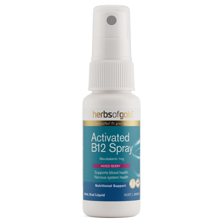 Herbs of Gold Activated B12 Spray provides high-strength methylcobalamin (vitamin B12) in a convenient, delicious mixed berry flavoured spray that readily absorbs under the tongue.