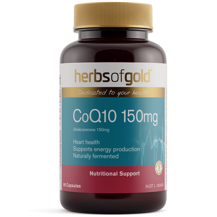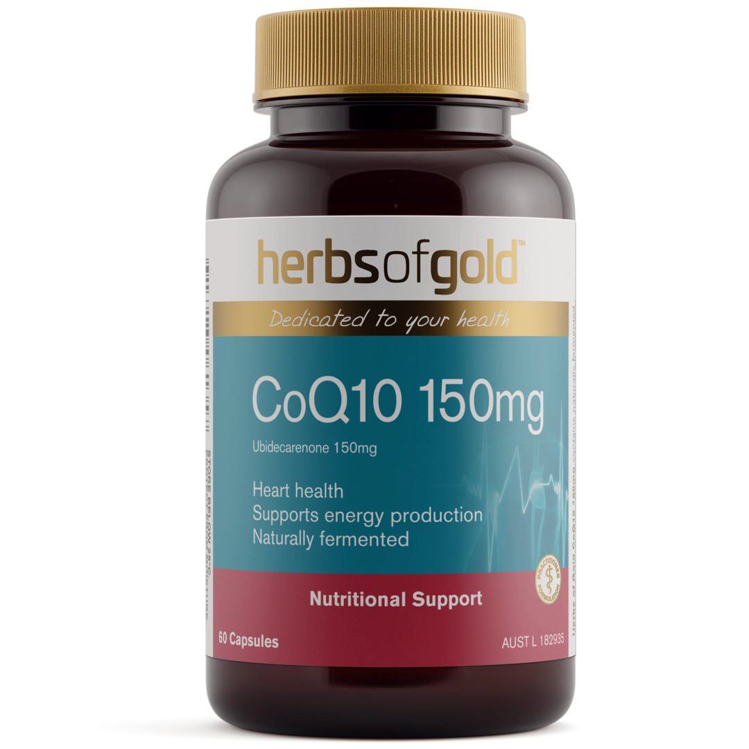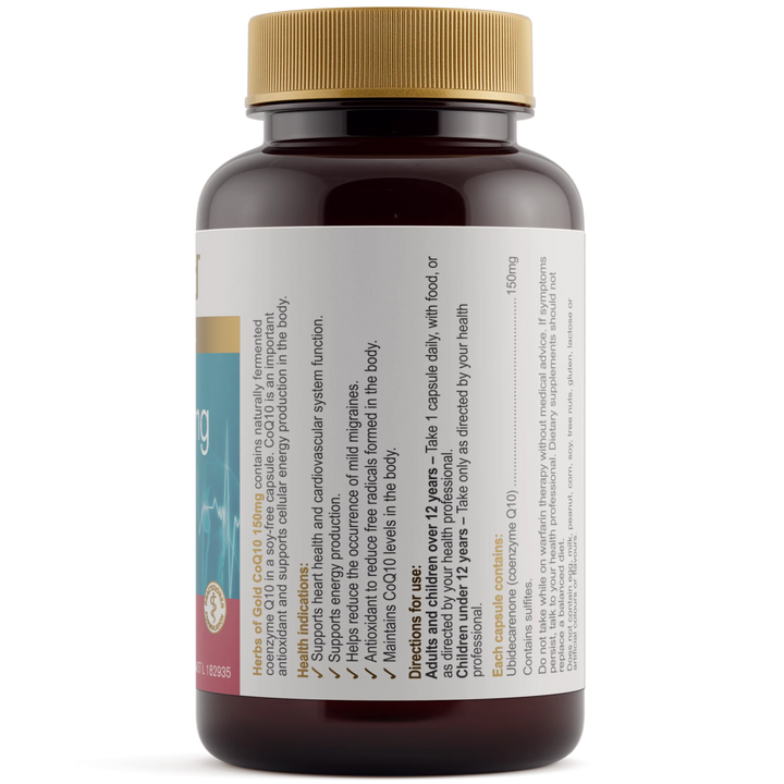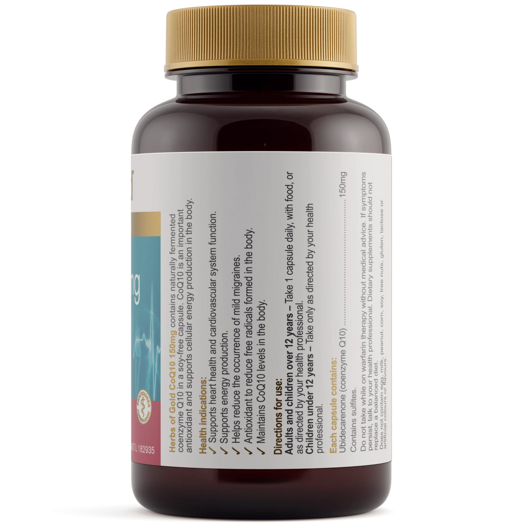 Herbs of Gold CoQ10 150mg contains naturally fermented coenzyme Q10 in a soy-free rice bran oil base.