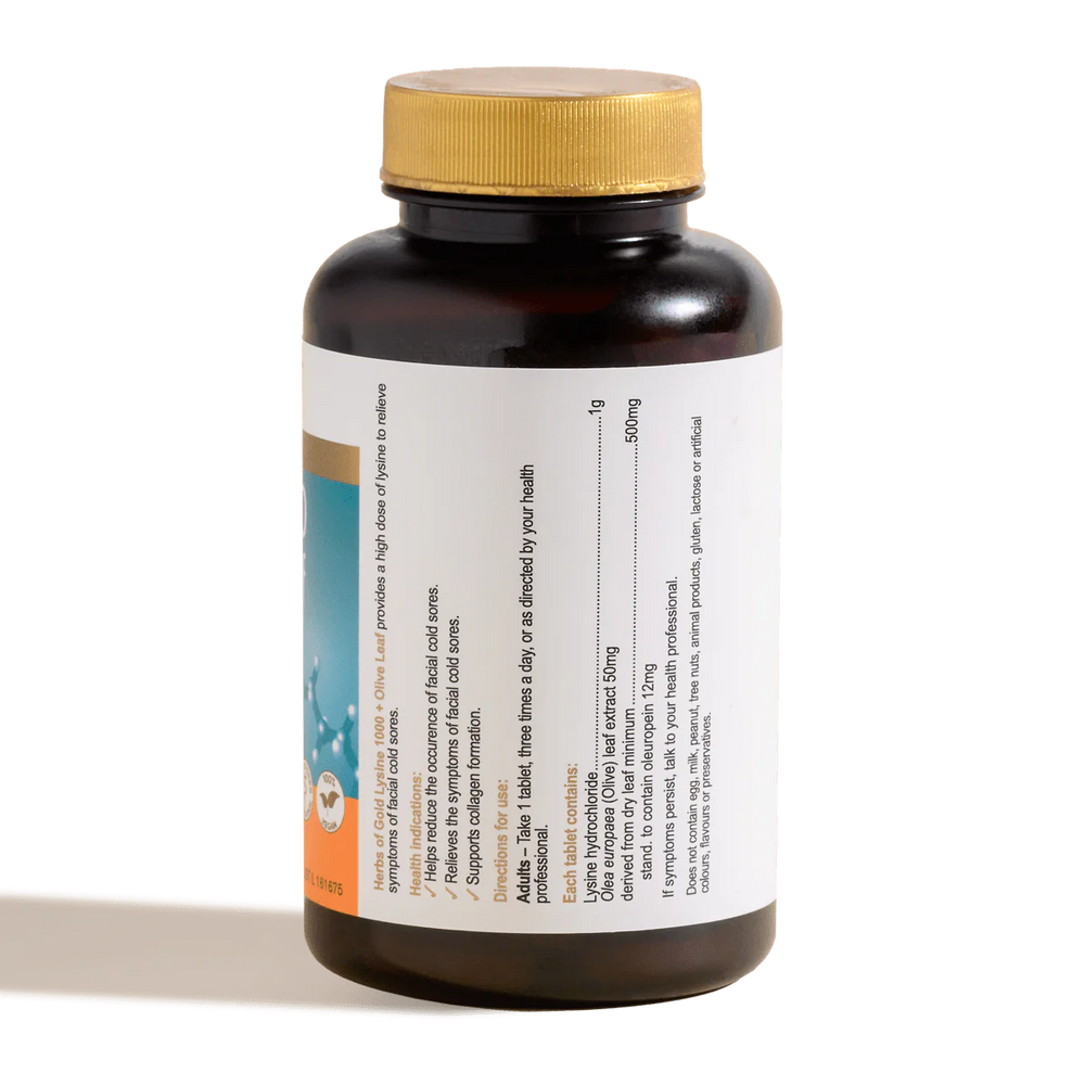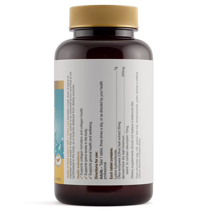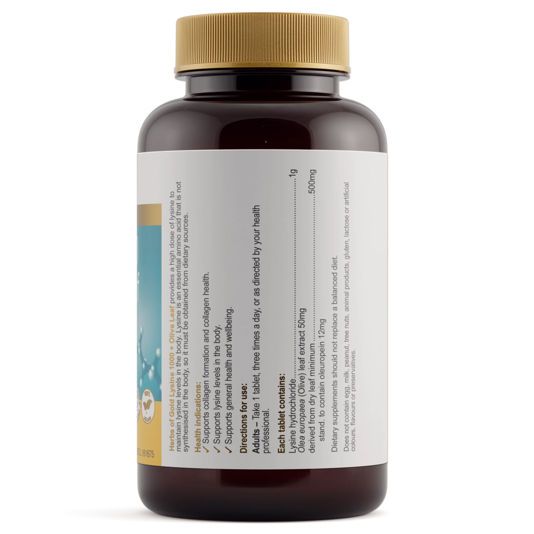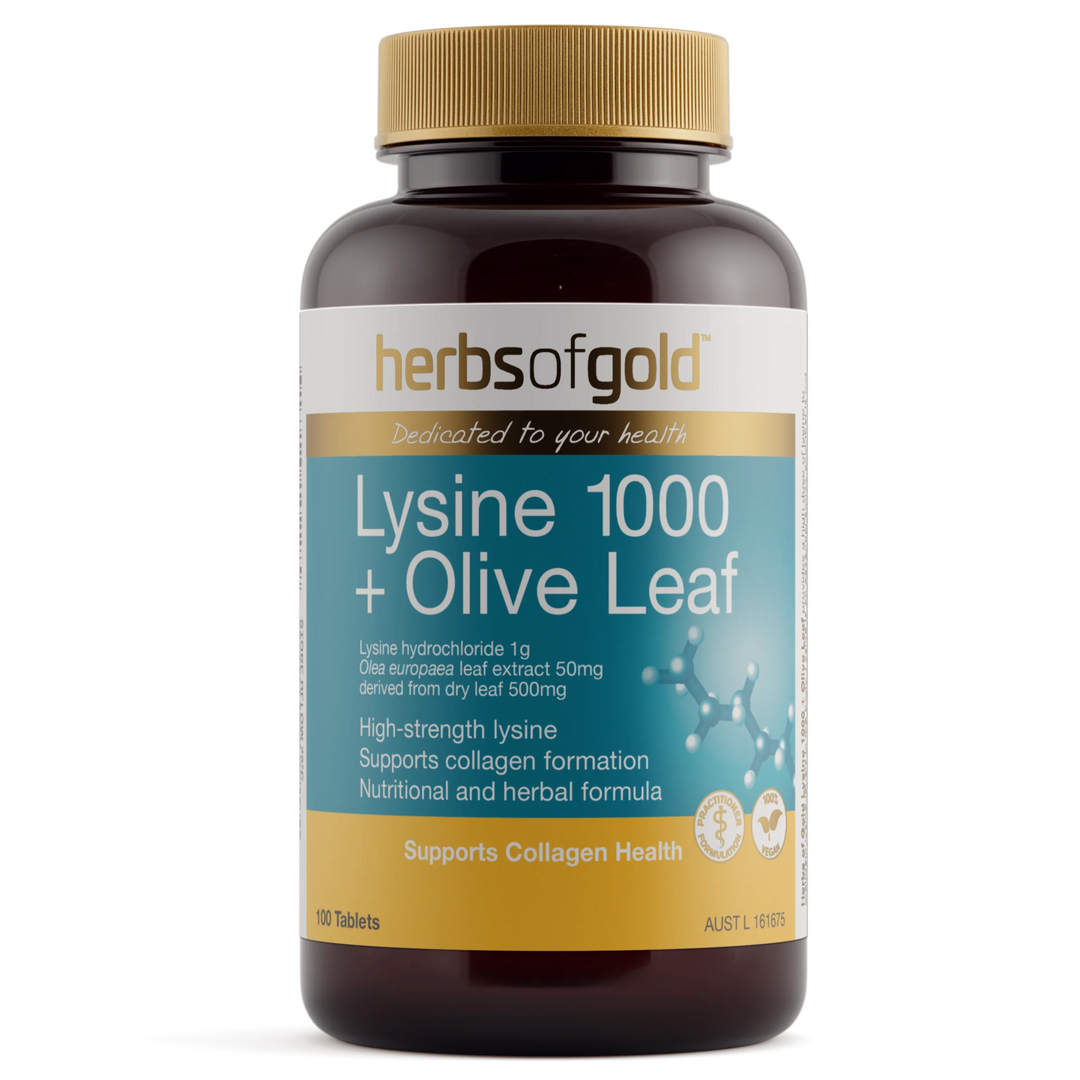 • Lysine 1000 + Olive Leaf contains 1000mg of the amino acid lysine plus a standardised extract of Olive leaf.