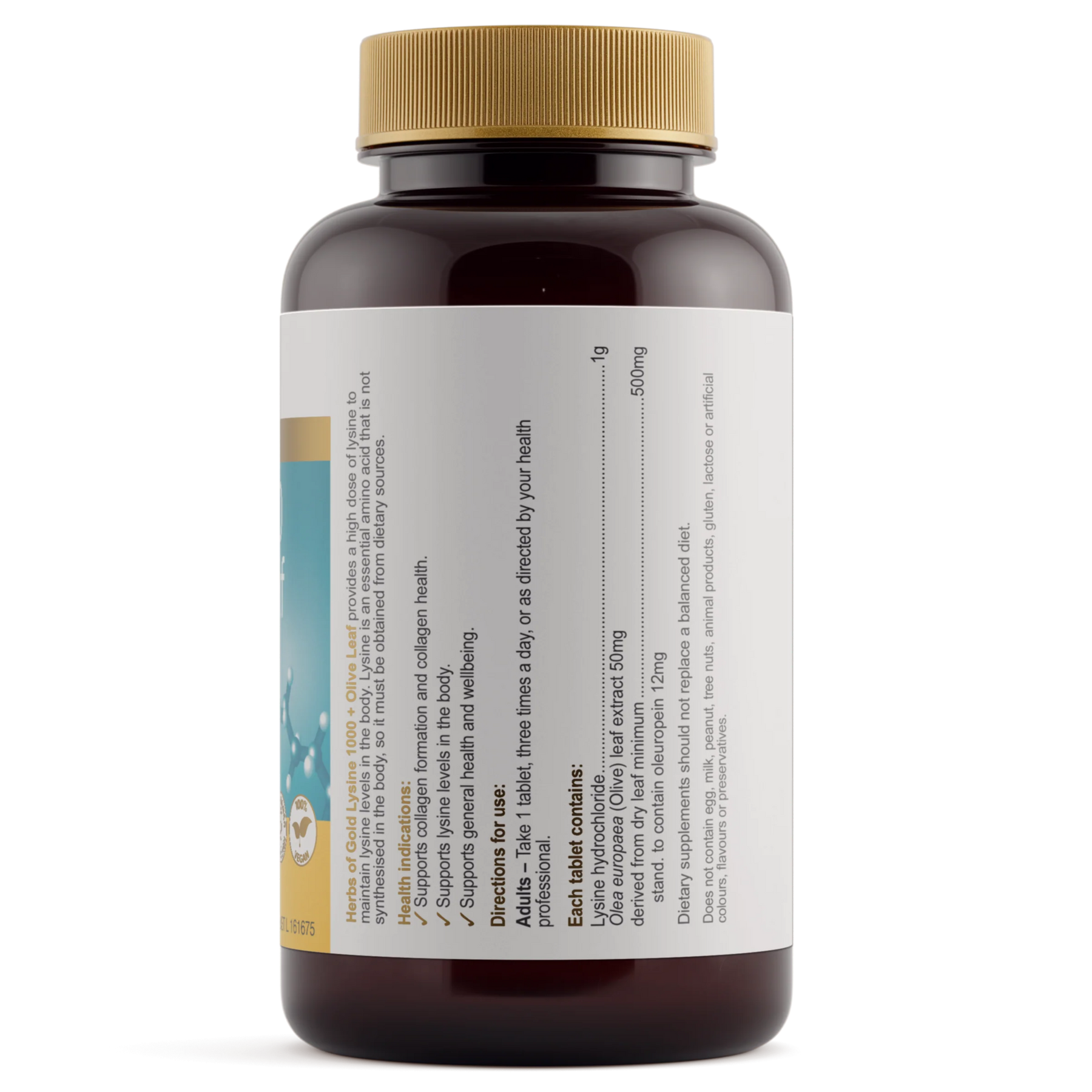 Herbs of Gold Lysine 1000 + Olive Leaf contains high-strength lysine to support collagen formation.