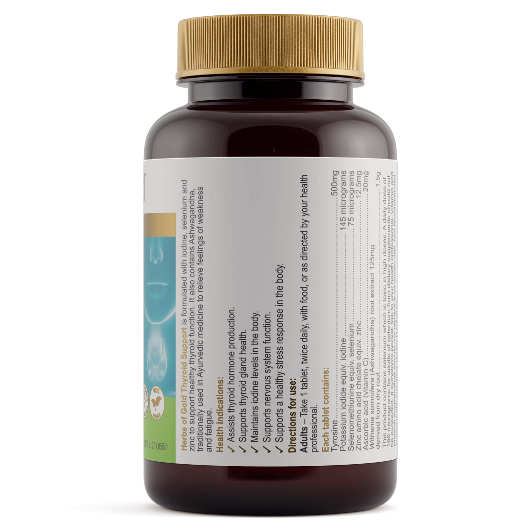 Tyrosine500mgPotassium iodide equiv. iodine145 microgramsSelenomethionine equiv. selenium75 microgramsZinc amino acid chelate equiv. zinc12.5mgAscorbic acid (vitamin C)20mgWithania somnifera(Ashwagandha) root extract 125mgderived from dry root1.5g