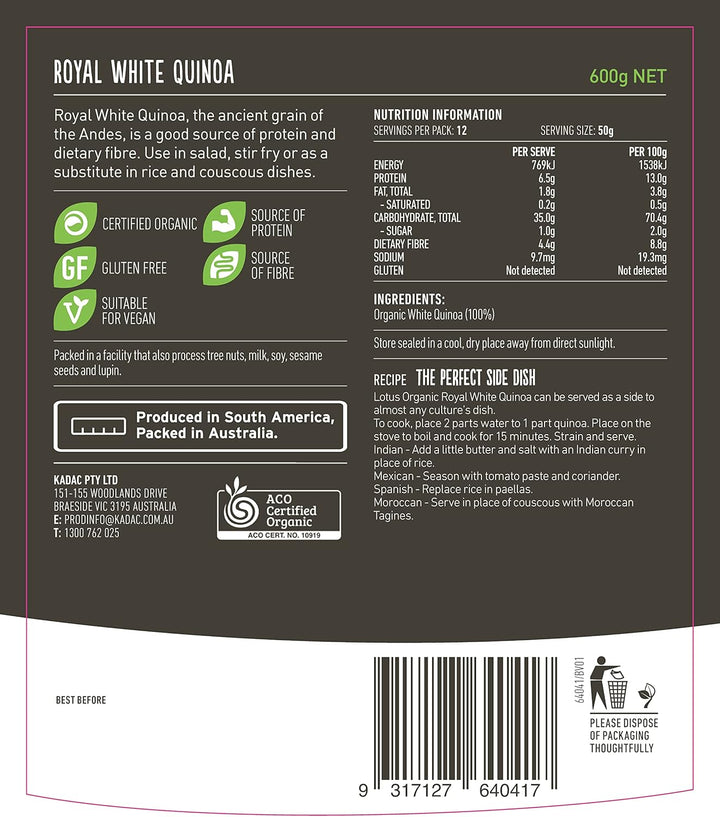 Lotus Organic Quinoa is certified organic, gluten free, a source of protein and fibre and suitable for vegan.