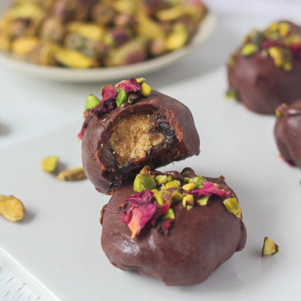 Organic Medjool Date, Aussie Peanuts, Organic Cacao Powder, Organic Brown Rice Syrup, Organic Coconut Oil, Rose Petals, Pistachios.