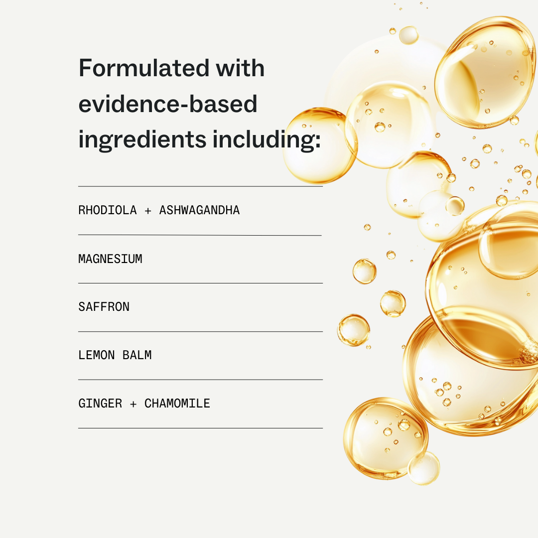 Sleep + Stress contains ingredients that help you master your mornings, find your flow, and reclaim your calm, all while reducing restlessness and improving sleep at night.